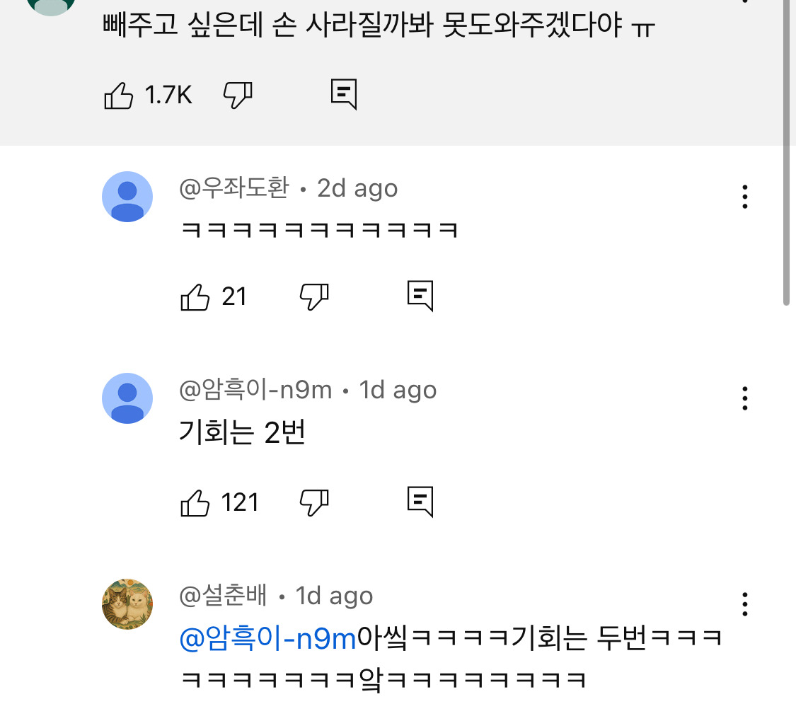 이빨에 낀 거 빼달라고 인간에게 오는 호랑이;;;;; 1 0 8시간전 다음 페이지 이전 페이지 귀여운데 무서워서 빼주겠냐고 ㅋㅋㅋㅋㅋㅋㅋㅋㅋ 출처 : https://m.bboom.naver.com/best/get?boardNo=9&postNo=4361970 이전글현실적인 40대 남성의 소개팅 다음글소개팅 자리에 친척들 데리고 온 중국 여성 댓글[0] 네이버 뿜 댓글[] 네이버 뿜 댓글 쓰기
